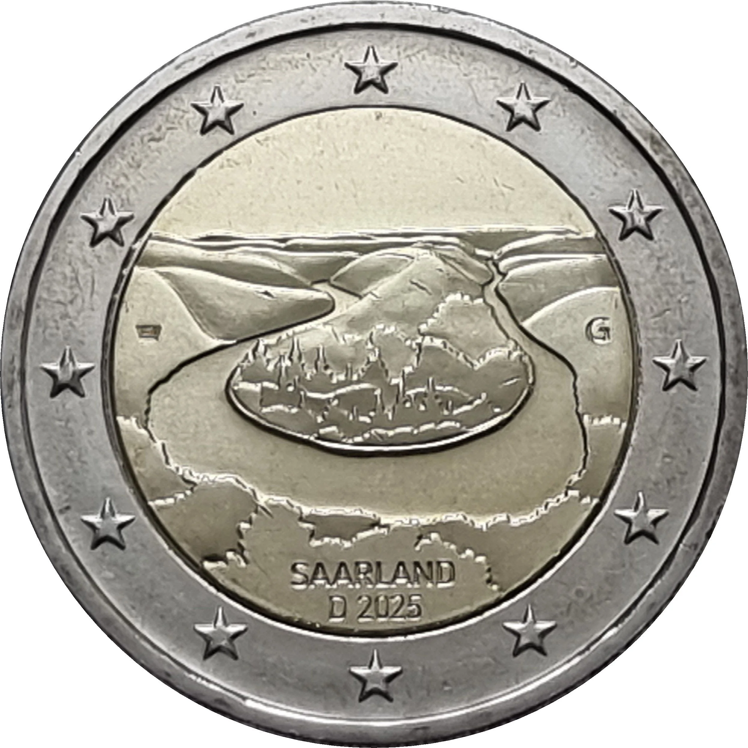 Bird's-eye view of the wooded Saar loop river. Artist's mark upper left, mint mark right. Nationality and year at bottom.