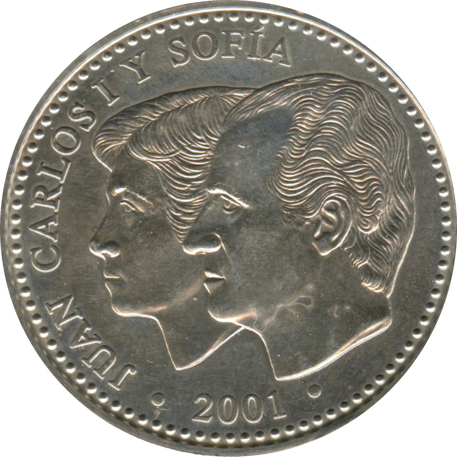Conjoined heads of King Juan Carlos I and Queen Sofía, facing left.