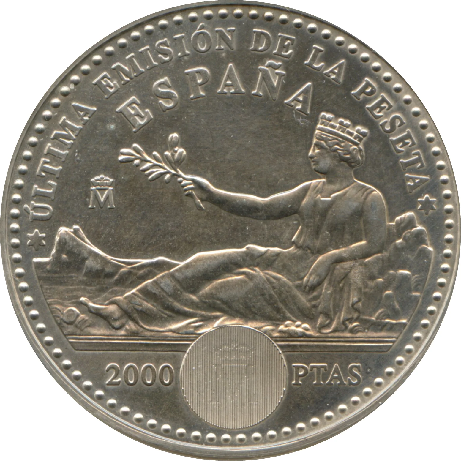 Reclining crowned Hispania rests against the Pyrenees, with Gibraltar at her feet and an olive branch in her right hand. Latent round image (Madrid mintmark and "01").