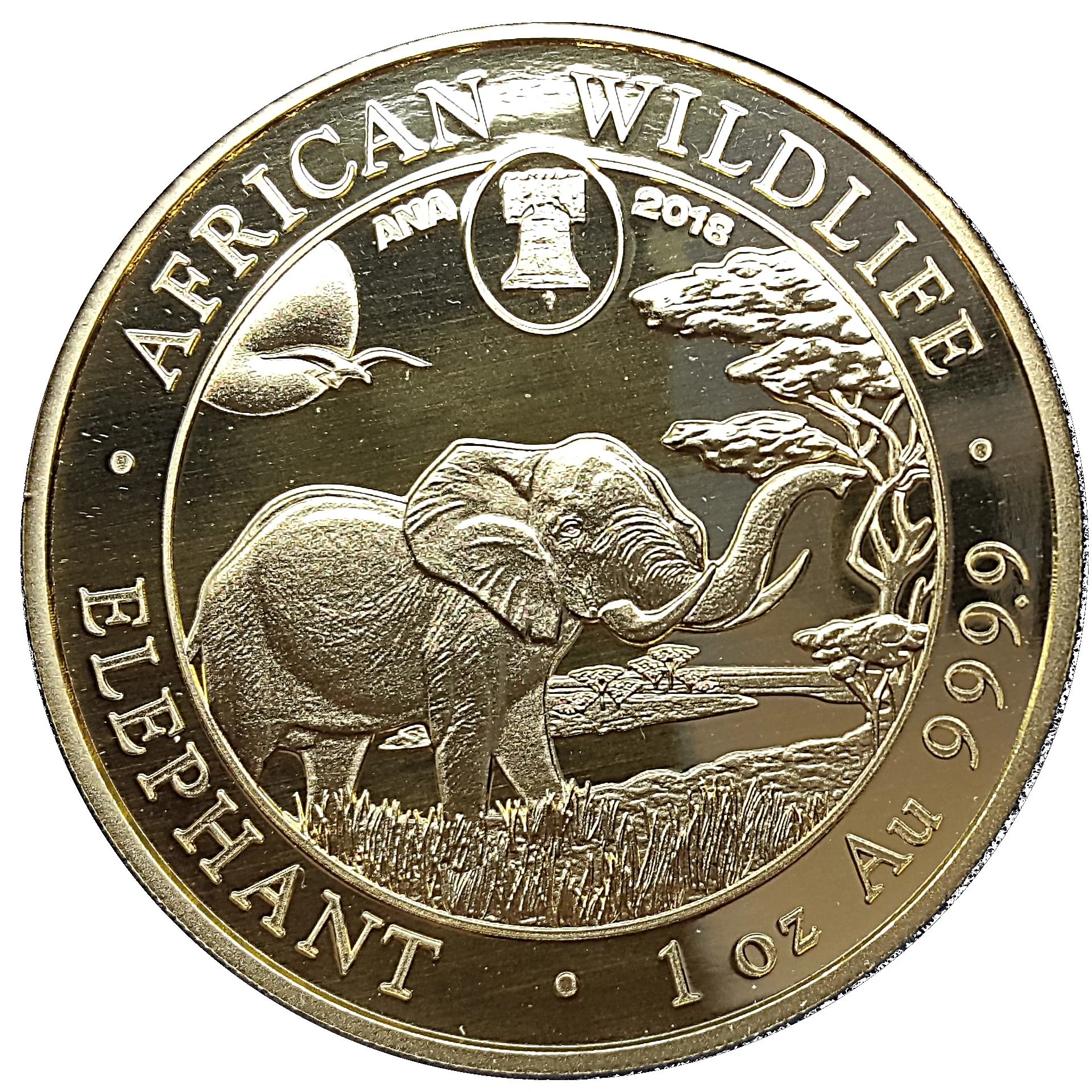 The coin features the 2019 African Wildlife Elephant design, an African elephant in its habitat, along with a "ANA 2018" Privy Mark depicting the Liberty Bell.