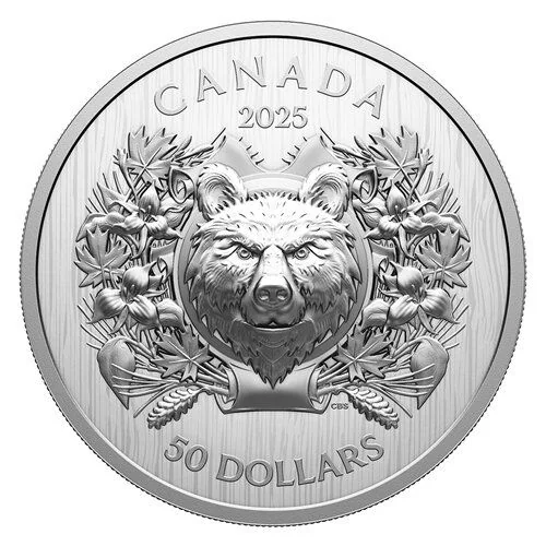 Set against woodgrain, the reverse features Ontario’s black bear crest in Extraordinarily High Relief within a cartouche. The stylized, forward-facing bear meets the viewer’s gaze. An Ultra High Relief wreath of Ontario’s white pine and trillium, plus stylized maple leaves, surrounds it, with pine cones, buds, and maple keys symbolizing renewal and hope.
