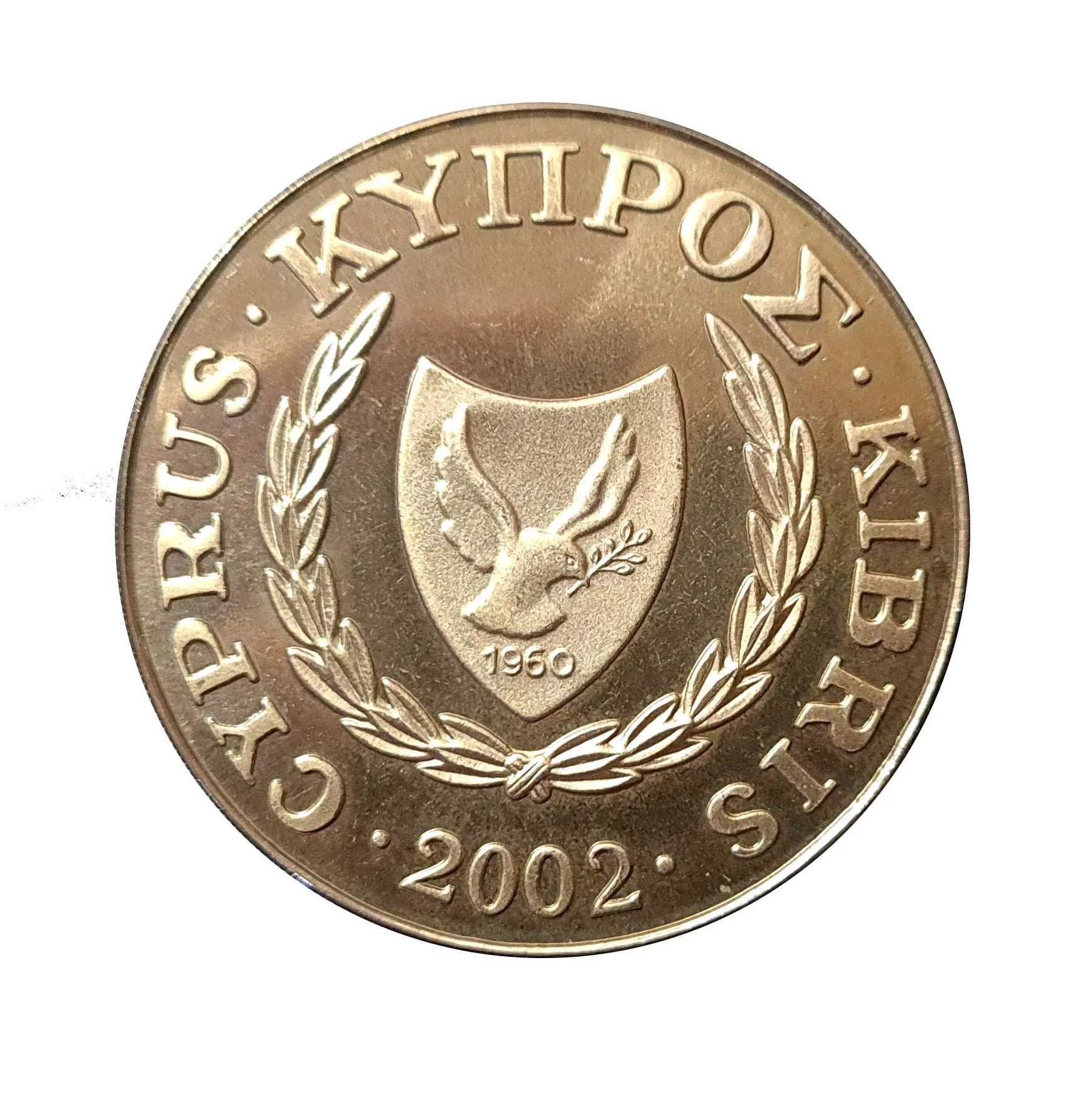 A dove with an olive twig and "1960," surrounded by laurels. "Cyprus" in Greek and Turkish.