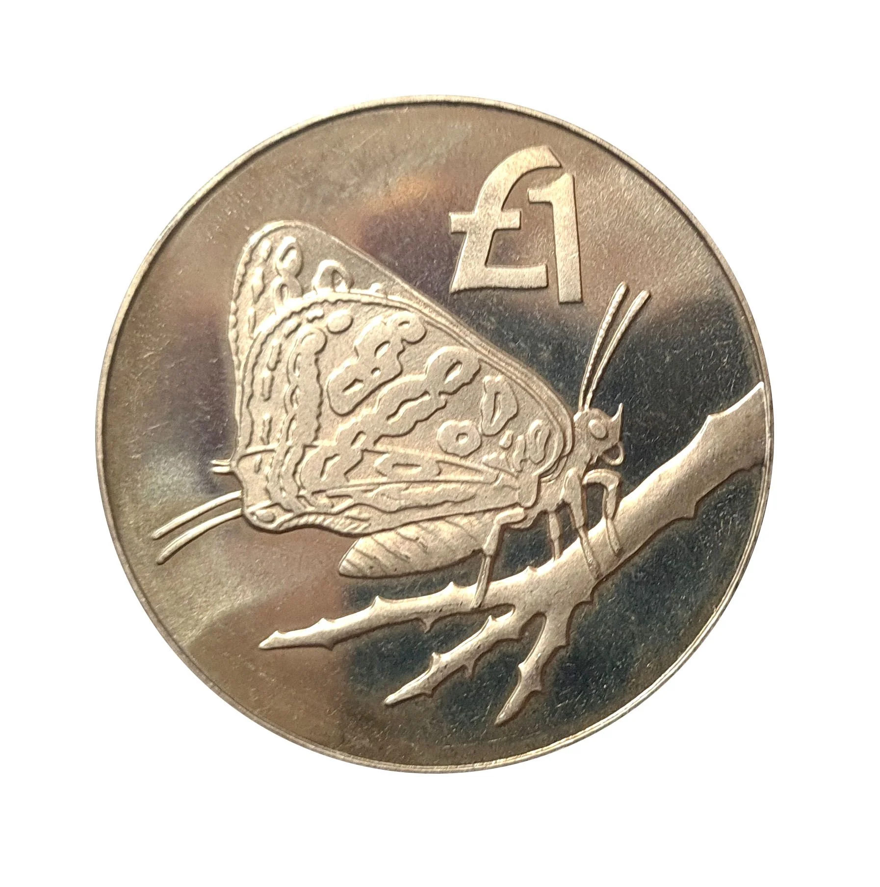 A £1 coin featuring the Cyprus Butterfly on a branch.