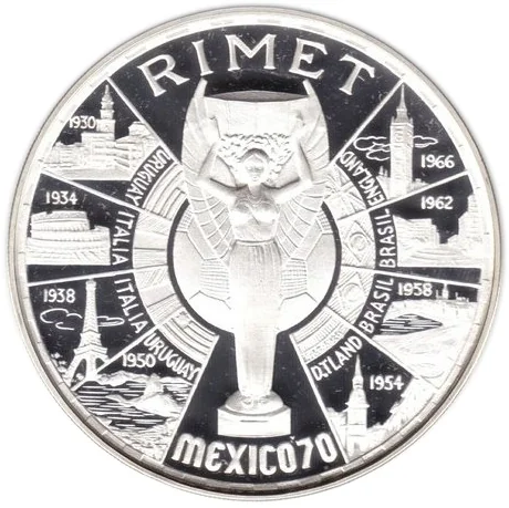 The Jules Rimet Trophy features eight panels, each depicting a landmark from a previous host nation alongside its winner's name and flag.
