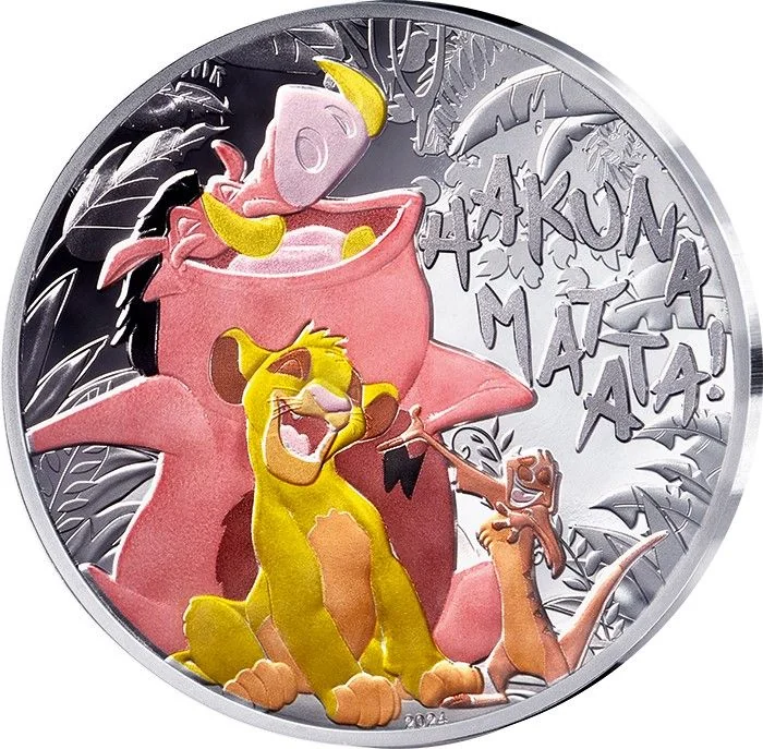 A collectible silver coin depicting Timon, Pumbaa, and Simba singing "Hakuna Matata."