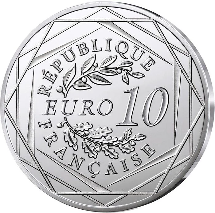"10 EURO" flanked by laurel and oak branches, within three hexagons inscribed "RÉPUBLIQUE FRANÇAISE" and the year.