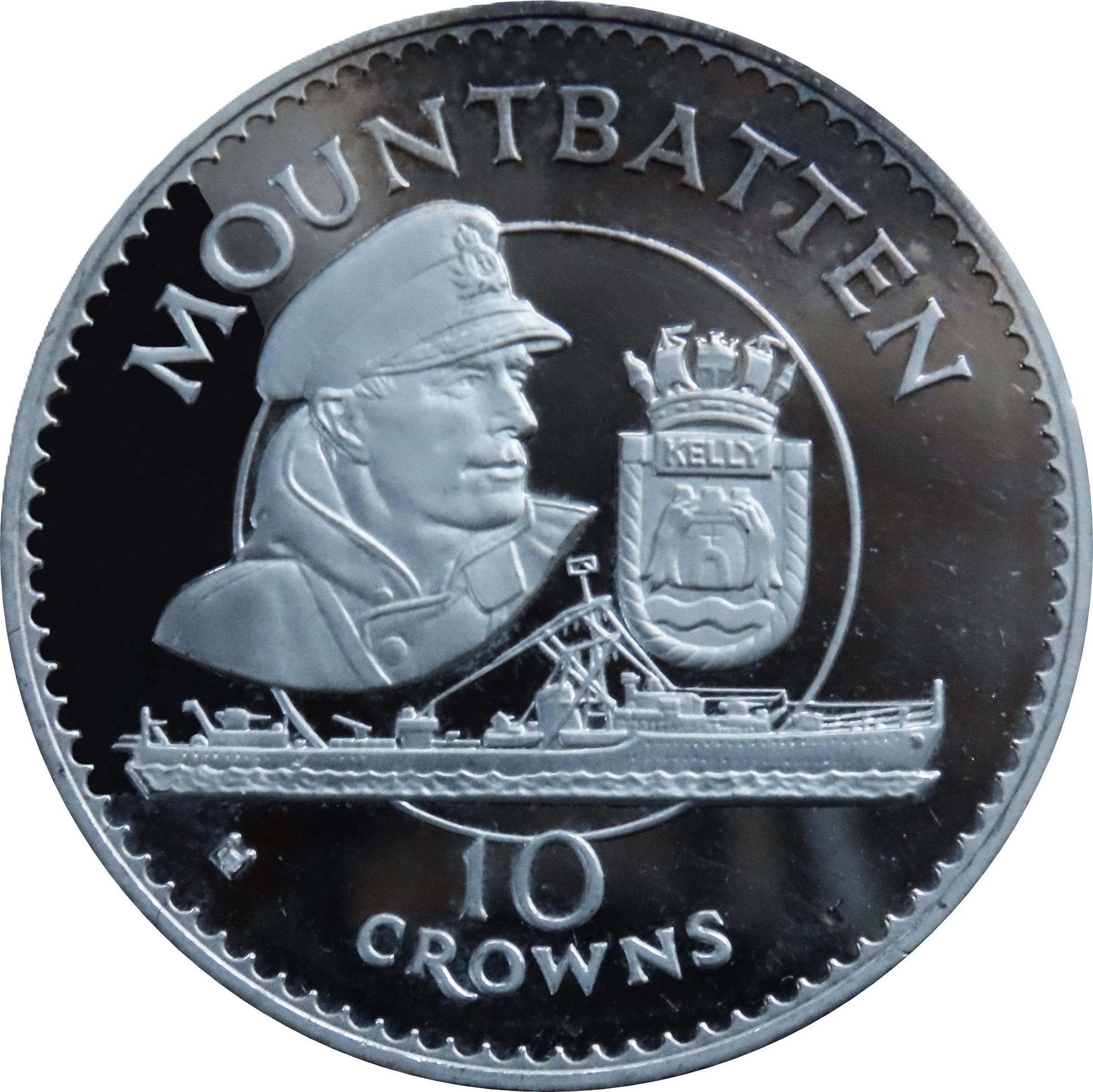 Lord Mountbatten facing right, crowned shield above H.M.S. Kelly, with mint mark and denomination below.