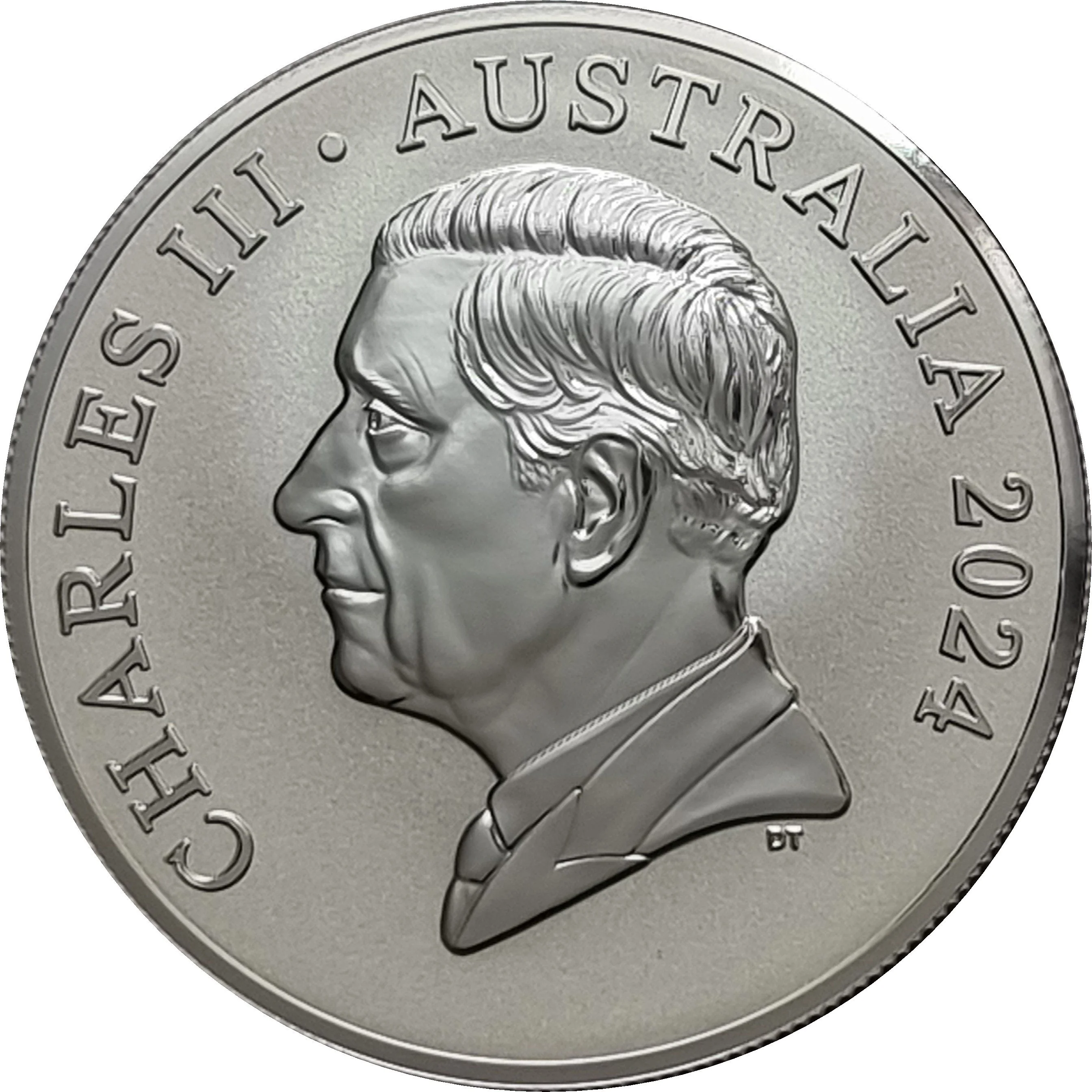 Uncrowned portrait of King Charles III facing left.