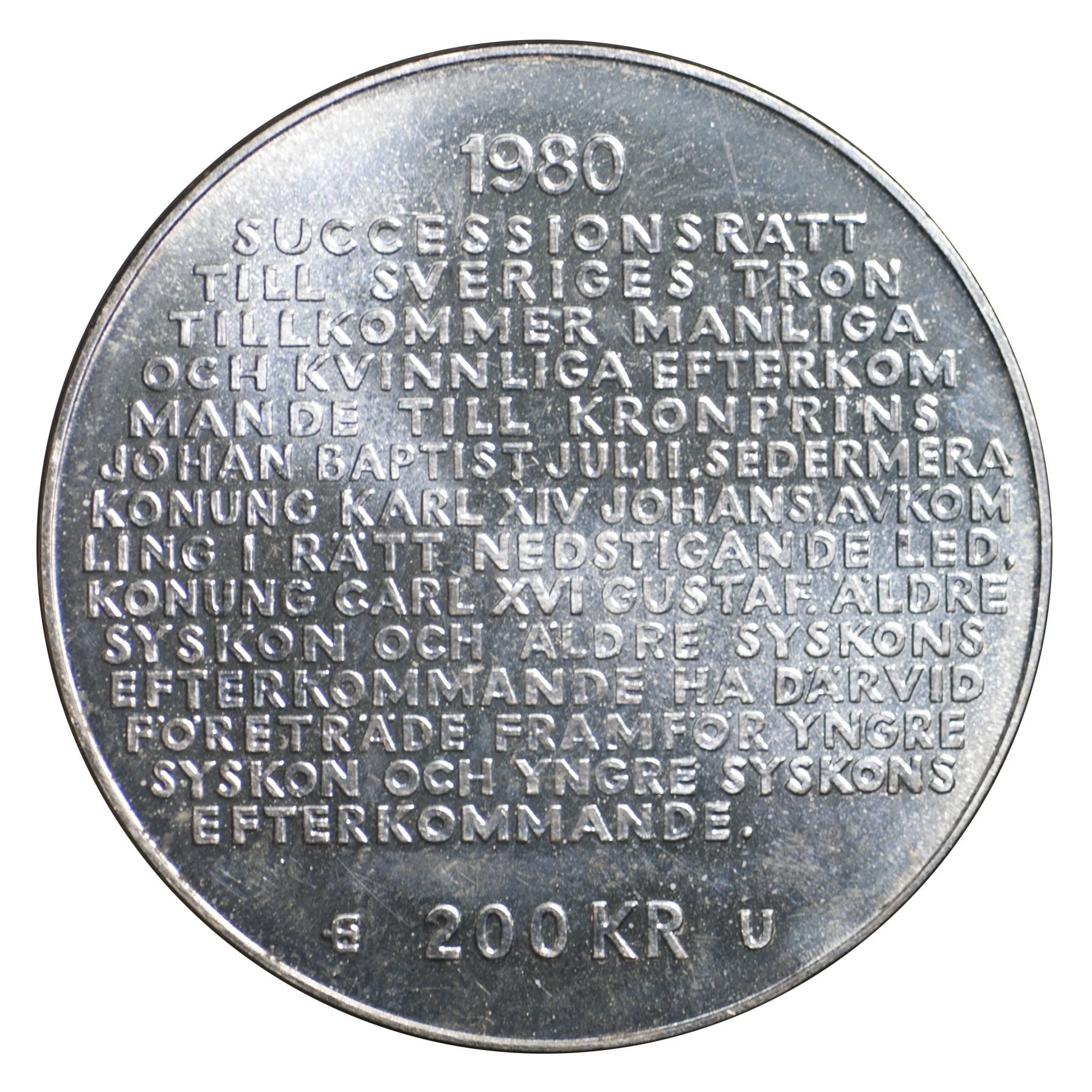Description: First article of the new Succession Law. Above the date, flanking the value, E (left) marks the Eskilstuna mint; U (right) is the Riksbank Governor's surname initial.