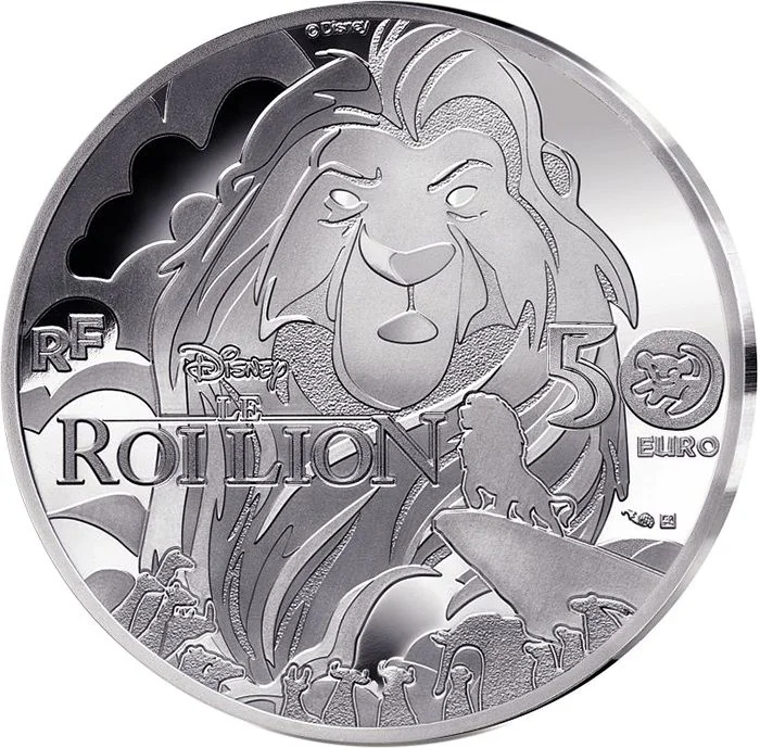 Mufasa rises majestically above Lion's Rock, with the coin's face value and French Republic initials inscribed.