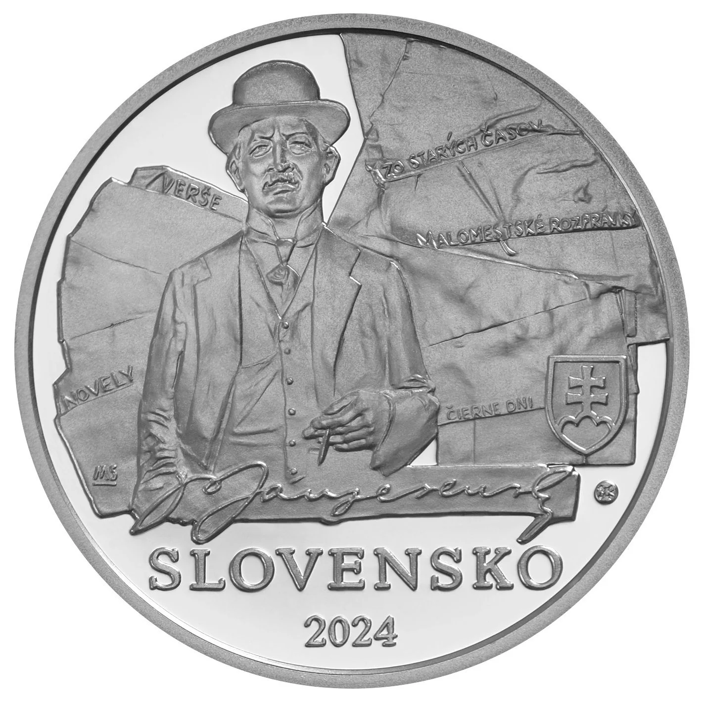The obverse features a portrait of Janko Jesenský with his facsimile signature. Behind him are sheets of paper listing his works: ‘NOVELY’, ‘VERŠE’, ‘ZO STARÝCH ČASOV’, ‘MALOMESTSKÉ ROZPRÁVKY’, and ‘ČIERNE DNI’. To the right is the Slovak coat of arms. At the bottom are ‘SLOVENSKO’ and ‘2024’. The Kremnica Mint mark (MK) is to the right of the signature, and the designer's initials (MS) are to the left.