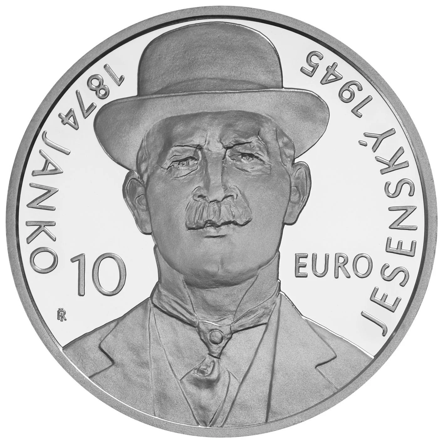 The reverse features a bust portrait of Janko Jesenský. To its left is '10', and to its right, 'EURO'. Along the upper left edge are '1874' and 'JANKO'; on the right are 'JESENSKÝ' and '1945'. The designer's initials 'IŘ' (Ivan Řehák) appear above his left shoulder.