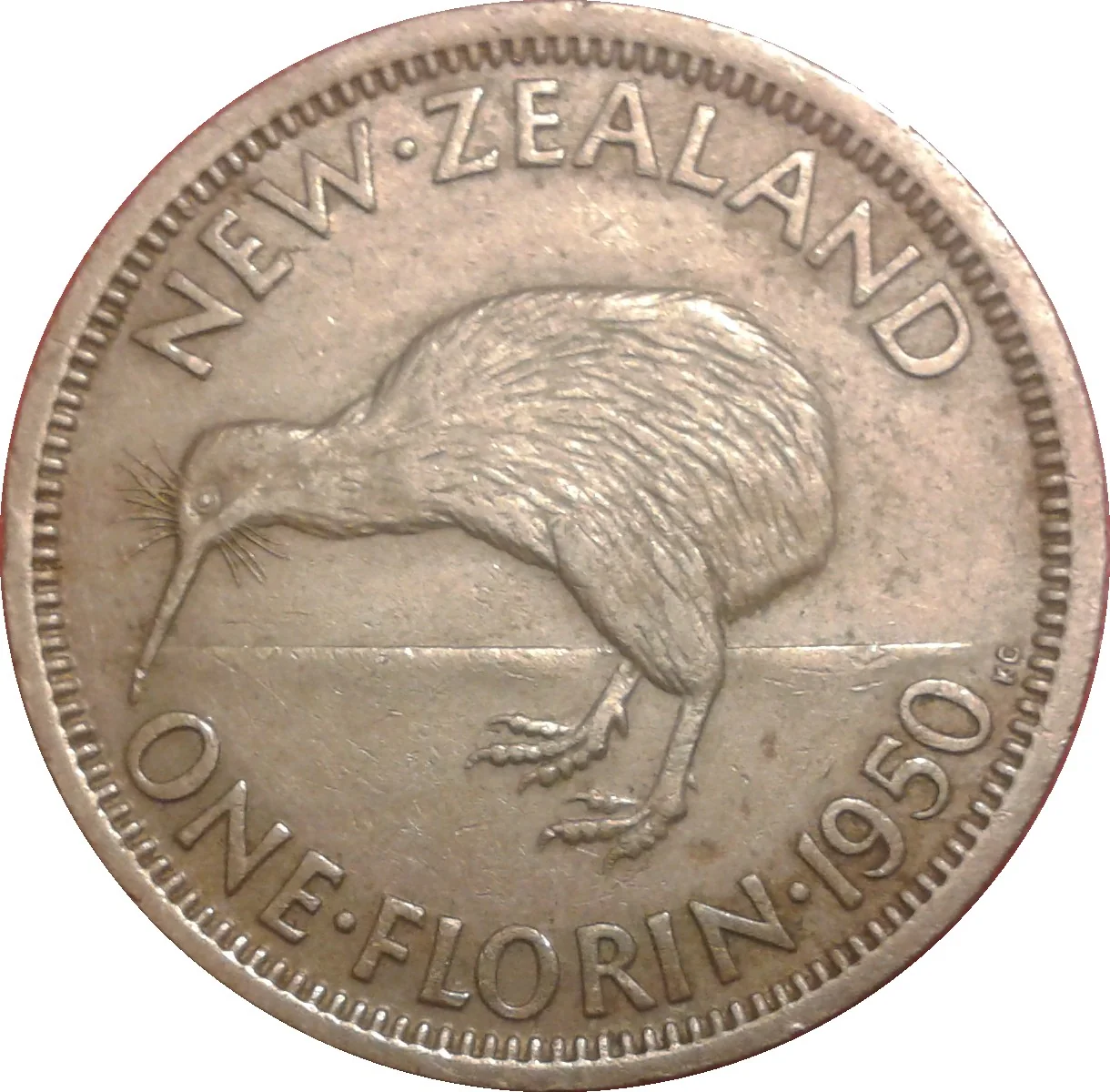 Kiwi left, legend above, denomination and date below.