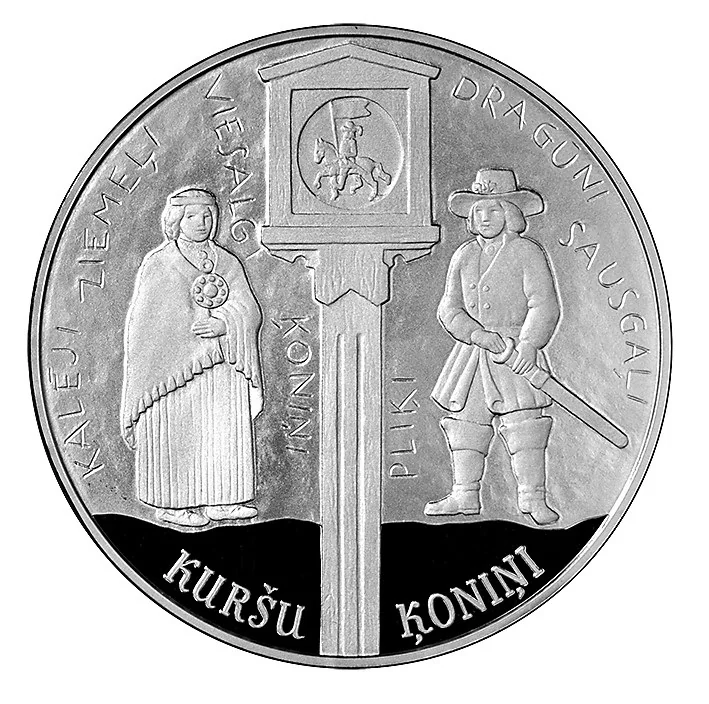The coin features the Peniķi column with Ķoniņciems' coat of arms, flanked by a woman in folk costume and a man with a sword. The background lists Courland's seven free villages: KALĒJI, ZIEMEĻI, VIESALGI, ĶONIŅI, PLIĶI, DRAGŪNI, and SAUSGAĻI. Below is the inscription KURŠU ĶONIŅI.