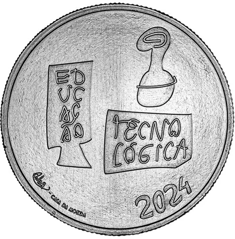 Right: a flask with "Educação" and "Tecnológica" on school boards. Lower left: author's name and "Casa da Moeda". Lower right: "2024".