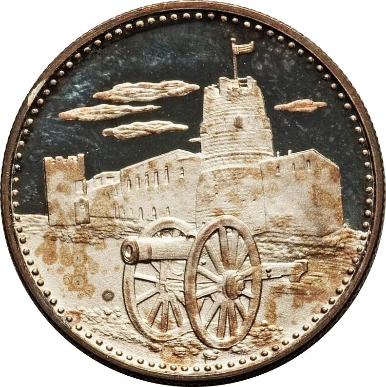 Coat of arms with crossed flags encircled by laurel; dates and value below.