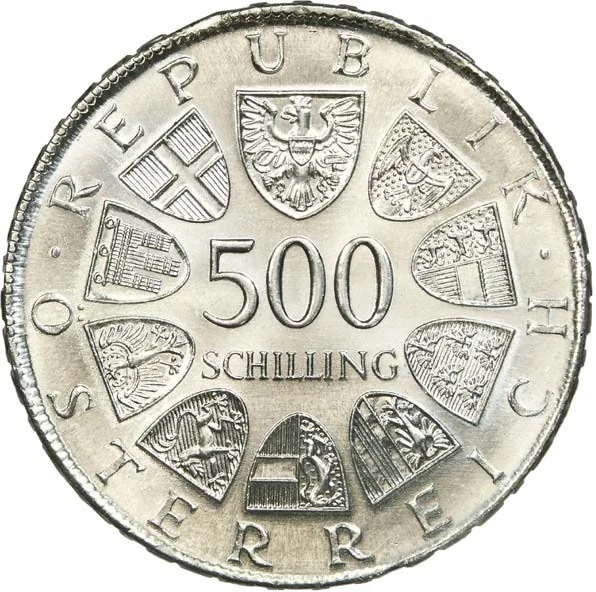 Face value encircled by ten coats of arms: Austria's at the top, surrounded by its nine federal states.