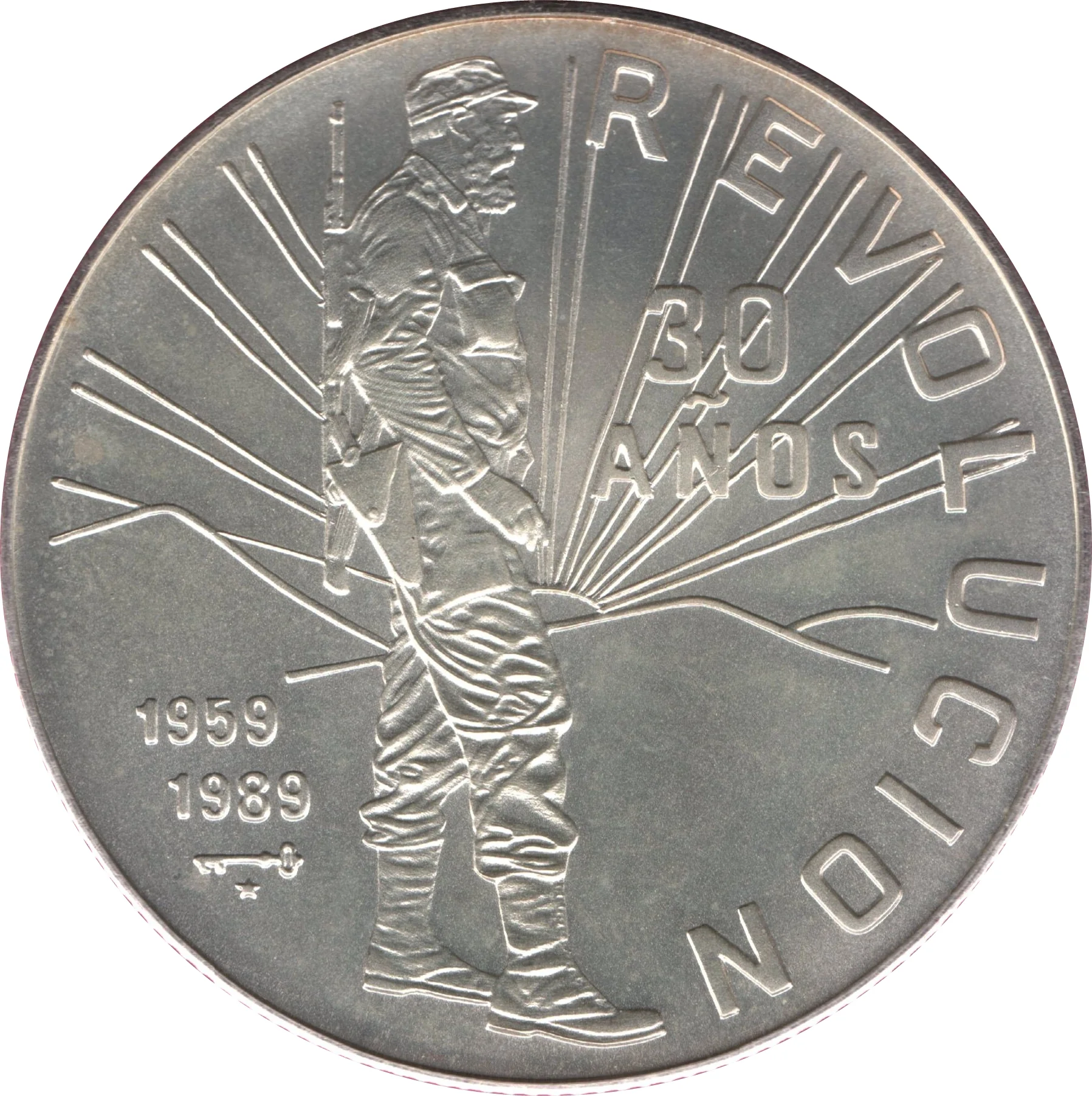 Cuban coat of arms with curved country name above, face value below, and weight and fineness on the sides.