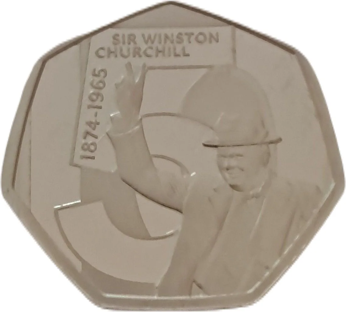 Churchill’s ‘V for Victory’ pose, with 150 and his birth and death dates behind him.