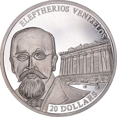 Bust of Eleftherios Venizelos before an ancient Greek temple.