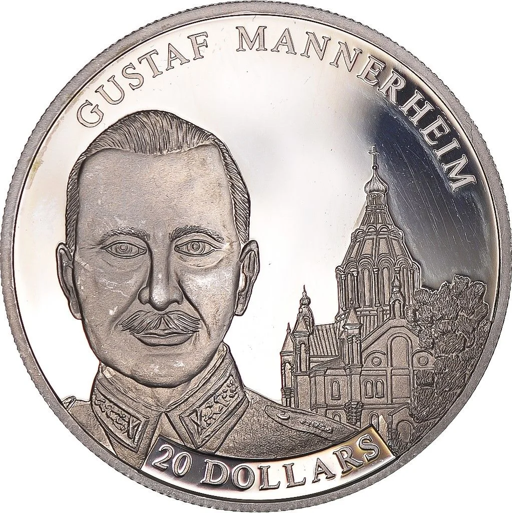 Bust of Gustaf Mannerheim facing forward with a church behind.