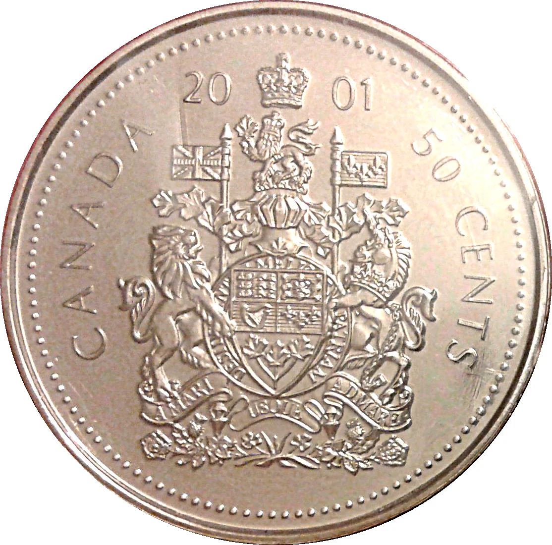 Canadian Royal Coat of Arms, proclaimed in 1921 and updated in 1994, encircled by face value and "CANADA."