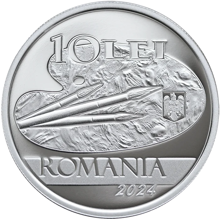 A 10 LEI graphic palette featuring Romania's coat of arms, the inscription "ROMANIA," and the year 2024.