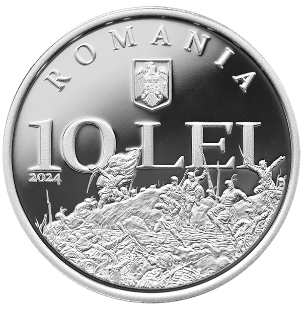 War of Independence battle scene, arched "ROMANIA," national coat of arms, "10 LEI," and "2024."