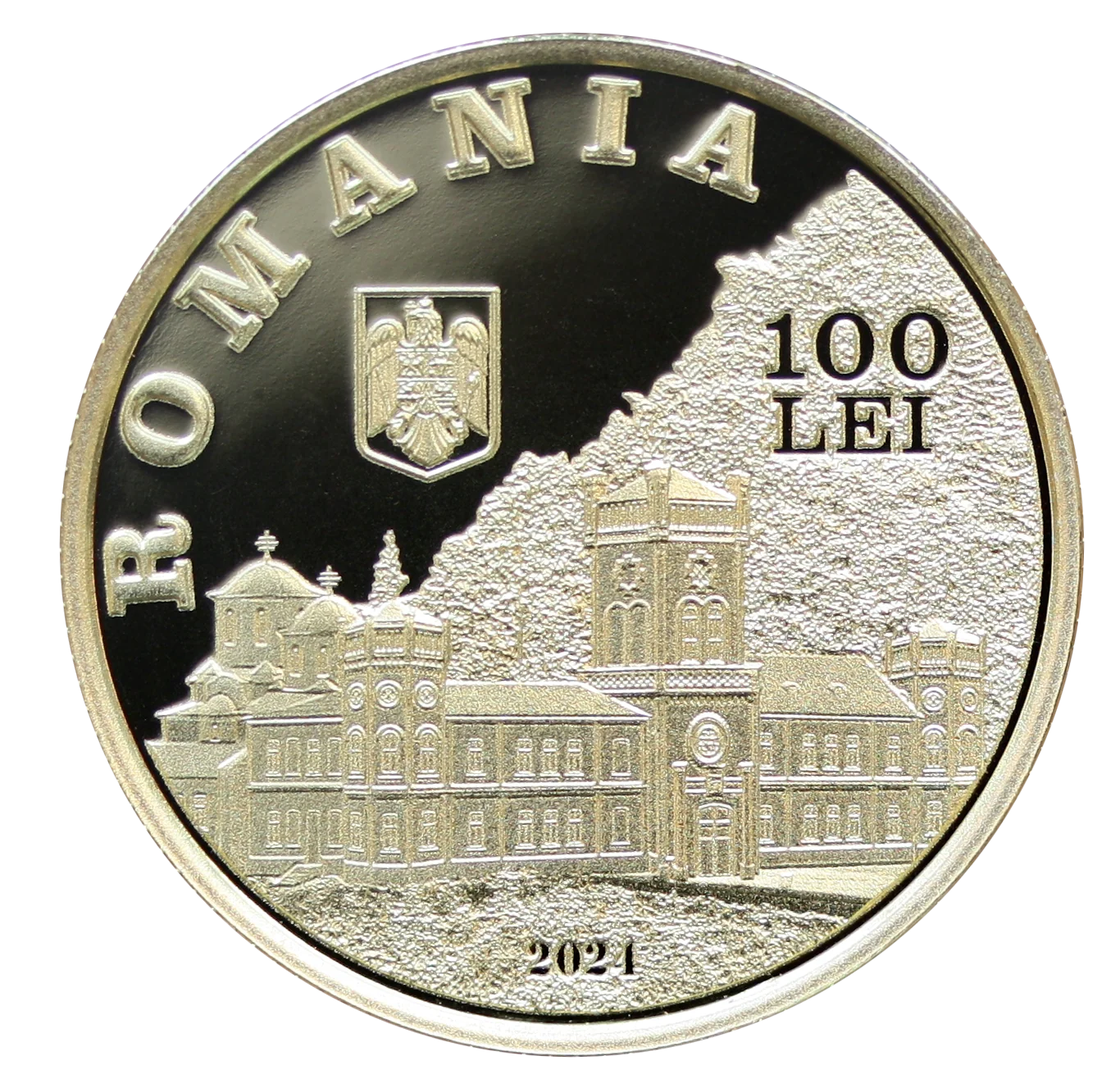 Tismana Monastery, site of the 1944 National Bank treasure evacuation, with arched "ROMANIA" inscription, Romania's coat of arms, face value "100 LEI," and issue year "2024."