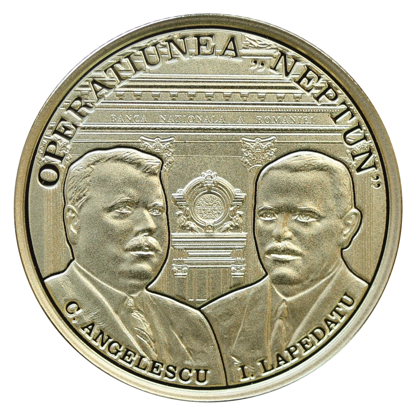 Portraits of NBR Governors Constantin Angelescu and Ion Lapedatu, the Old NBR Palace, and the inscription 'OPERATIUNEA „NEPTUN”'.