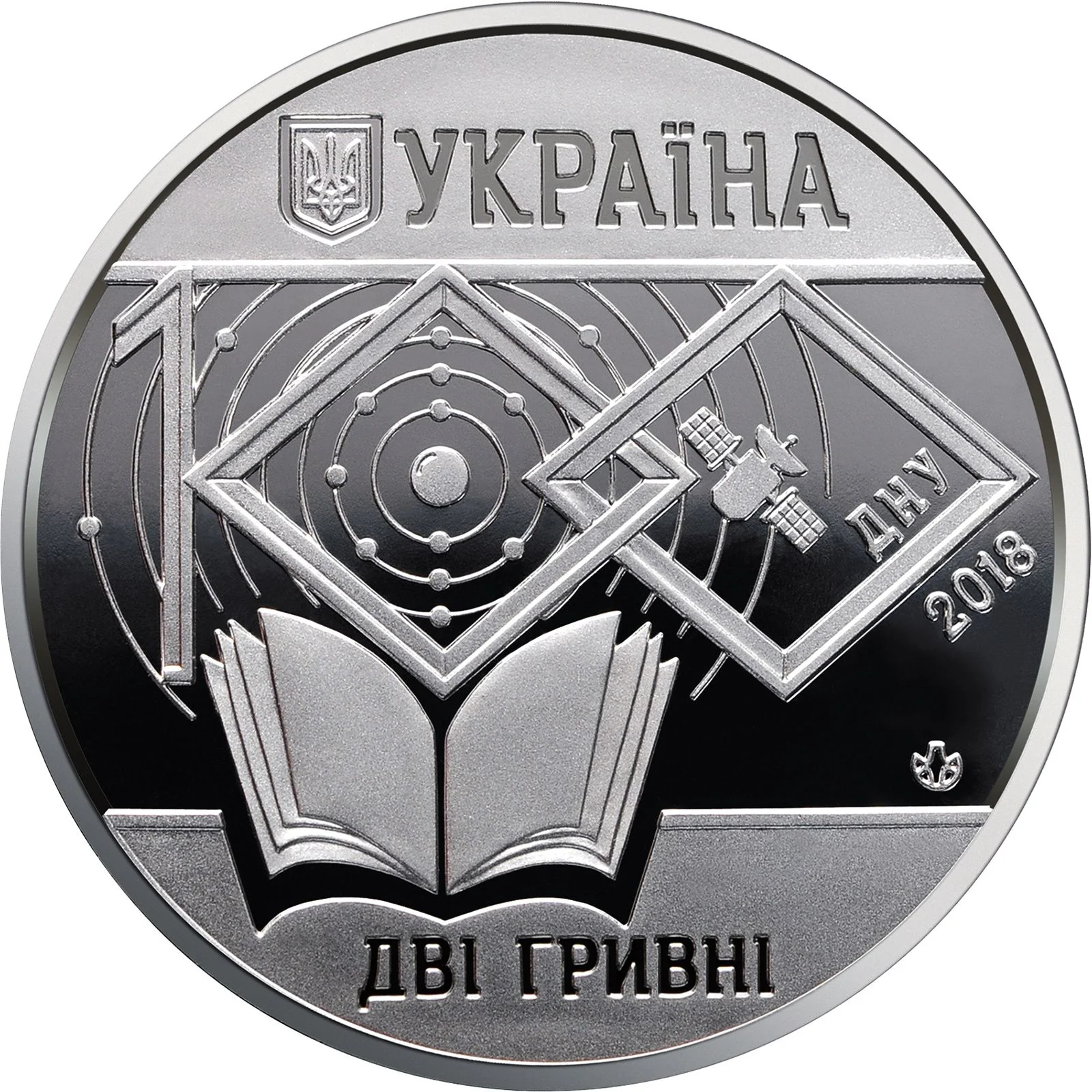 The coin features Ukraine's small coat of arms and the word "УКРАЇНА." The central "100" has zeros shaped as diamonds; one contains a satellite and "ДНУ." A book below the number symbolizes knowledge. At the bottom is "ДВІ ГРИВНІ," with the year 2018 and the mint mark to the right.