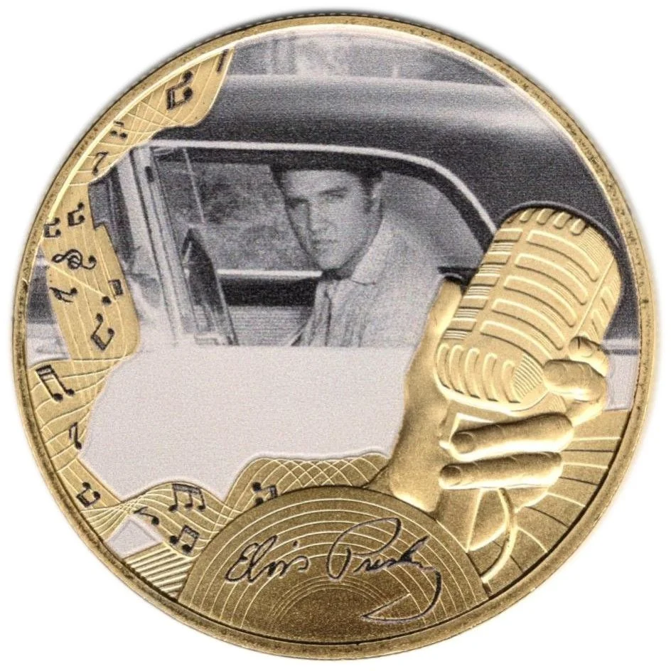Elvis Presley surrounded by "LOVE ME TENDER" and his autograph. The design includes a music staff, a hand holding his iconic microphone, and a partial vinyl record with his signature.