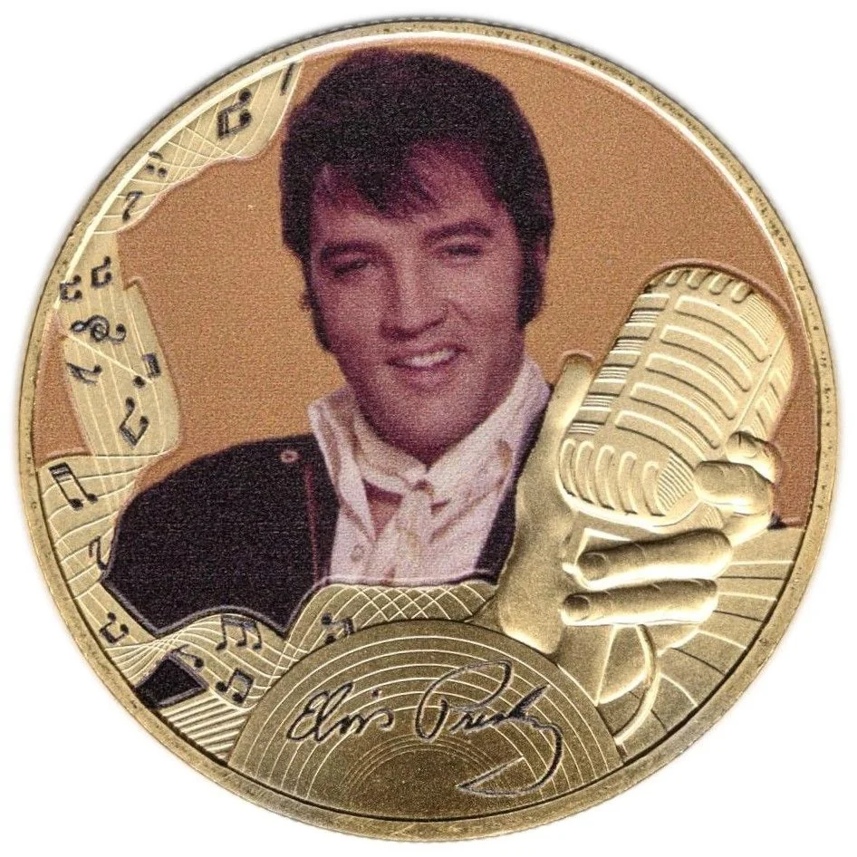 Iconic portrait of Elvis Presley with "SUSPICIOUS MINDS" and his autograph. The design includes a music staff with ribbons leading to his hand holding a 1960s microphone, and a partial vinyl record with his signature at the bottom.