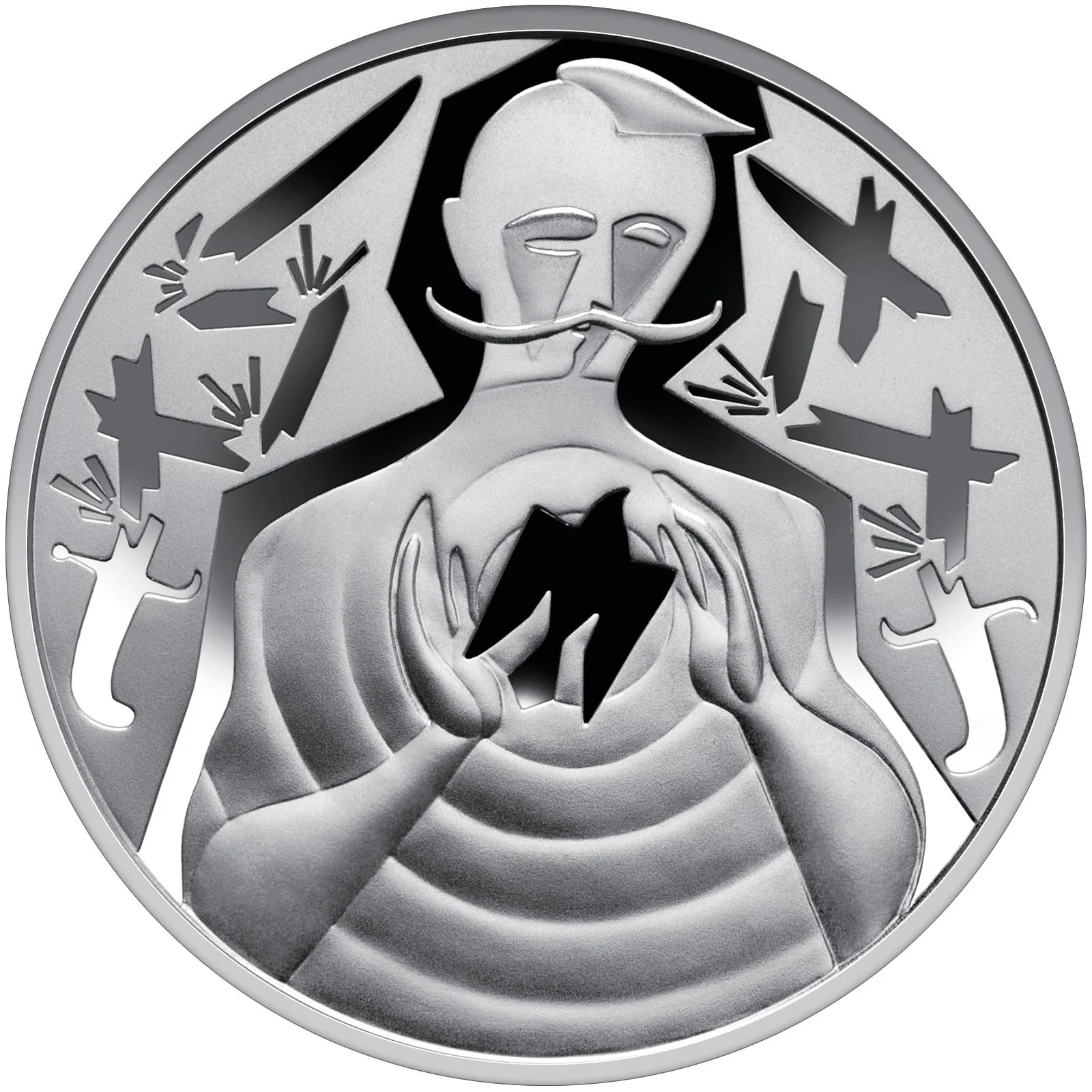 A Cossack guards a trident-shaped bird of freedom, linking Ukraine's current war to its Cossack spirit. Broken enemy sabers lie on a matte background.
