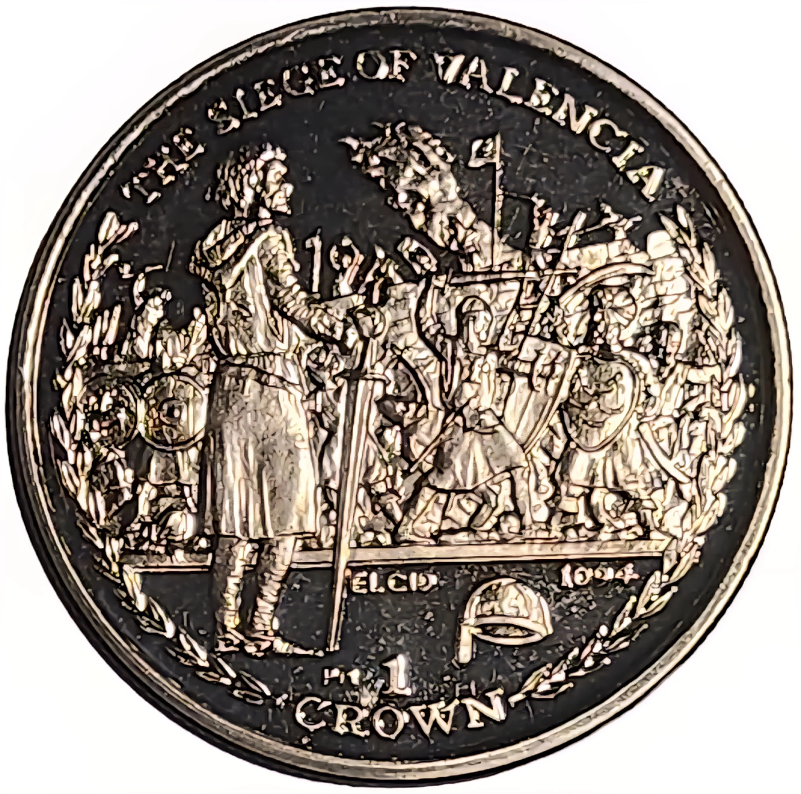 El Cid before the siege of Valencia, framed by a laurel wreath with inscriptions. Mint mark and denomination below.