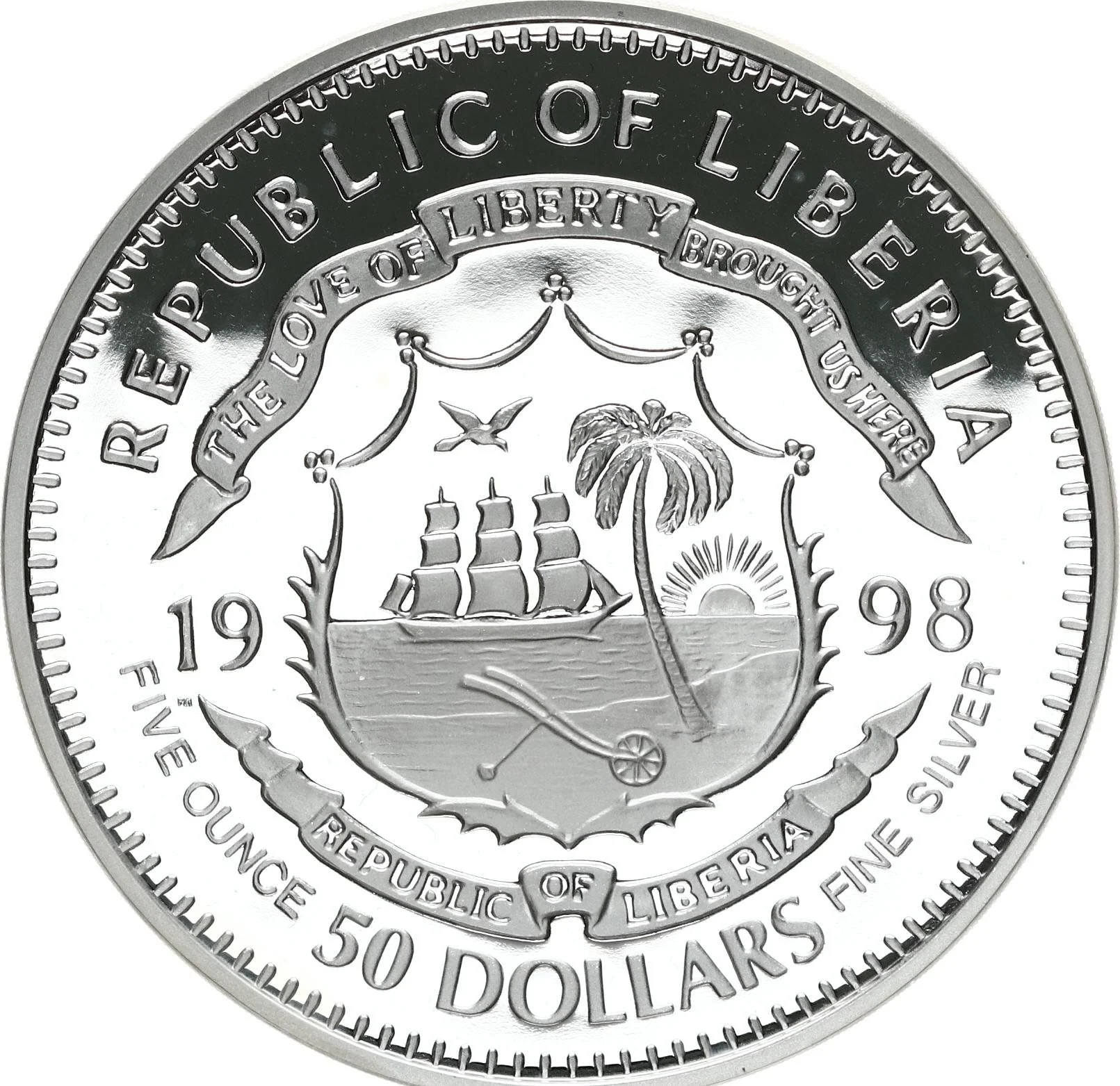 Liberian coat of arms divides date, denomination below.