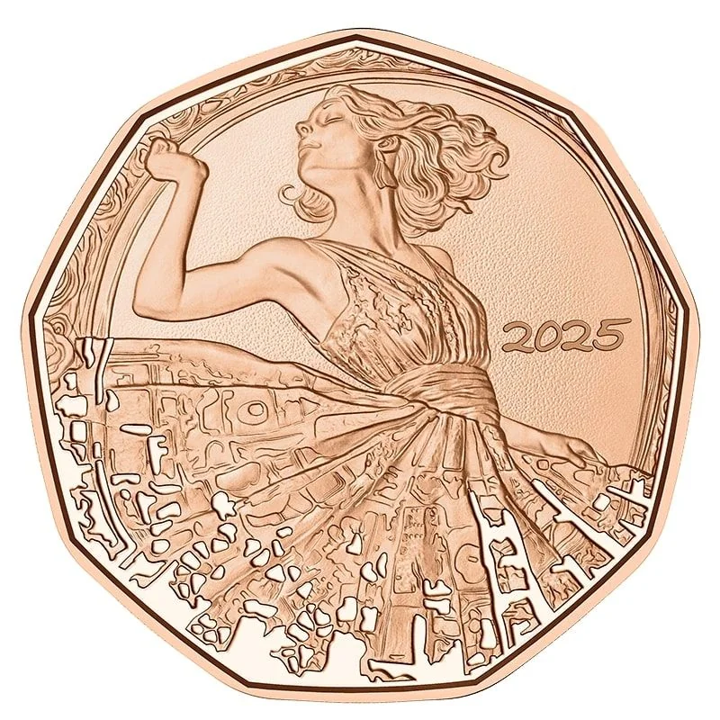 A dancing woman in a ball gown, representing dancer and choreographer Grete Wiesenthal, commemorating her 140th birthday. Year to the figure's right.
