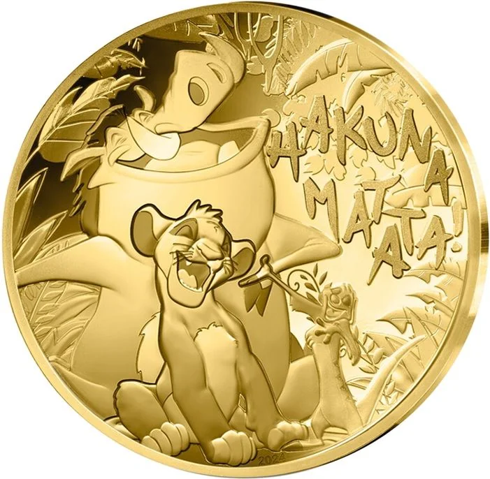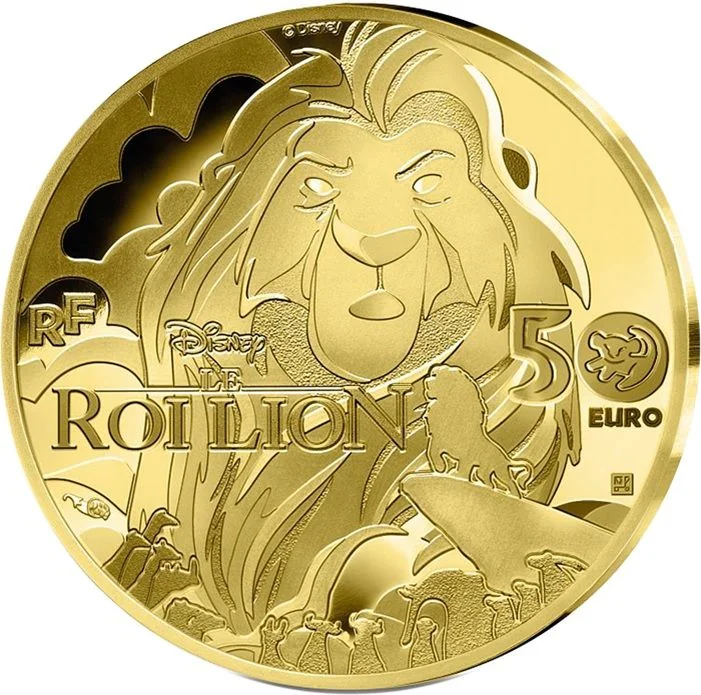 Mufasa rises majestically above Lion's Rock, with the coin's face value and French Republic initials inscribed.