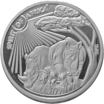 The reverse features three detailed rhinos with the inscriptions "SPIRIT OF AFRICA" and the issue year "2017".