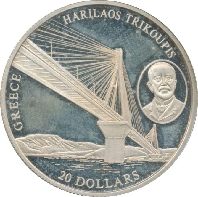 Greece's multi-span cable-stayed Rio–Antirrio Bridge with a bust of Prime Minister Charilaos Trikoupis.