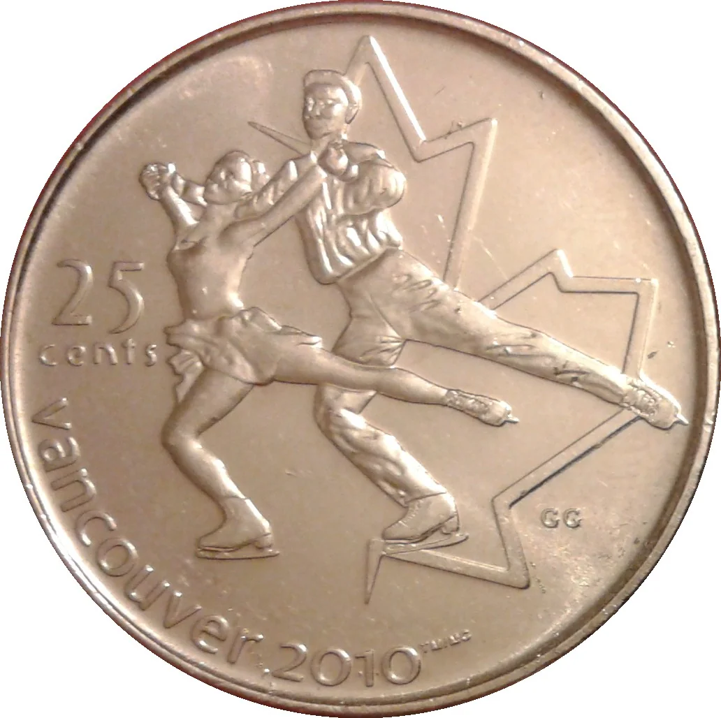Figure skaters before a stylized maple leaf, with the denomination at left.