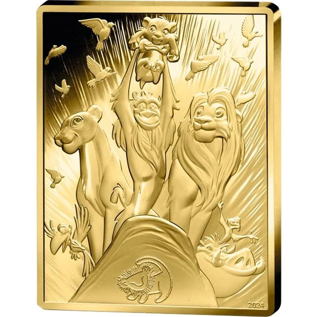 Mufasa stands majestically on Lion's Rock, symbolizing the strength and wisdom passed to Simba. The coin's face value and French Republic initials blend tradition with modernity, honoring this universal story.