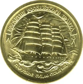 Coin depicting the sailing ship "Tovarishch." Inscriptions: "300-ЛЕТИЕ РОССИЙСКОГО ФЛОТА" above, "ПАРУСНОЕ СУДНО 'ТОВАРИЩ'" below. Mint mark left, date "1996" right.