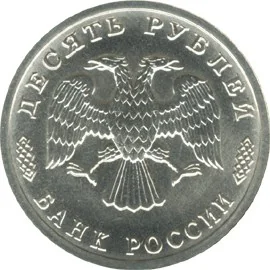 The two-headed eagle by I. Bilibin, with inscriptions along the rim: "ДЕСЯТЬ РУБЛЕЙ" (TEN ROUBLES) at the top and "БАНК РОССИИ" (BANK OF RUSSIA) at the bottom, separated by an ornament.