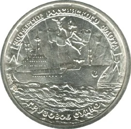 A cargo vessel with Hermes above it and a world map below. Around the rim: "300-ЛЕТИЕ РОССИЙСКОГО ФЛОТА" at the top, "ГРУЗОВОЕ СУДНО" at the bottom, the mint mark to the left, and "1996" to the right.