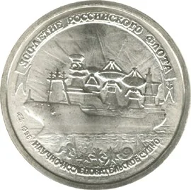 A research ship. Inscriptions: top – "300-ЛЕТИЕ РОССИЙСКОГО ФЛОТА"; bottom – "НАУЧНО-ИССЛЕДОВАТЕЛЬСКОЕ СУДНО"; left – mint mark; right – "1996".