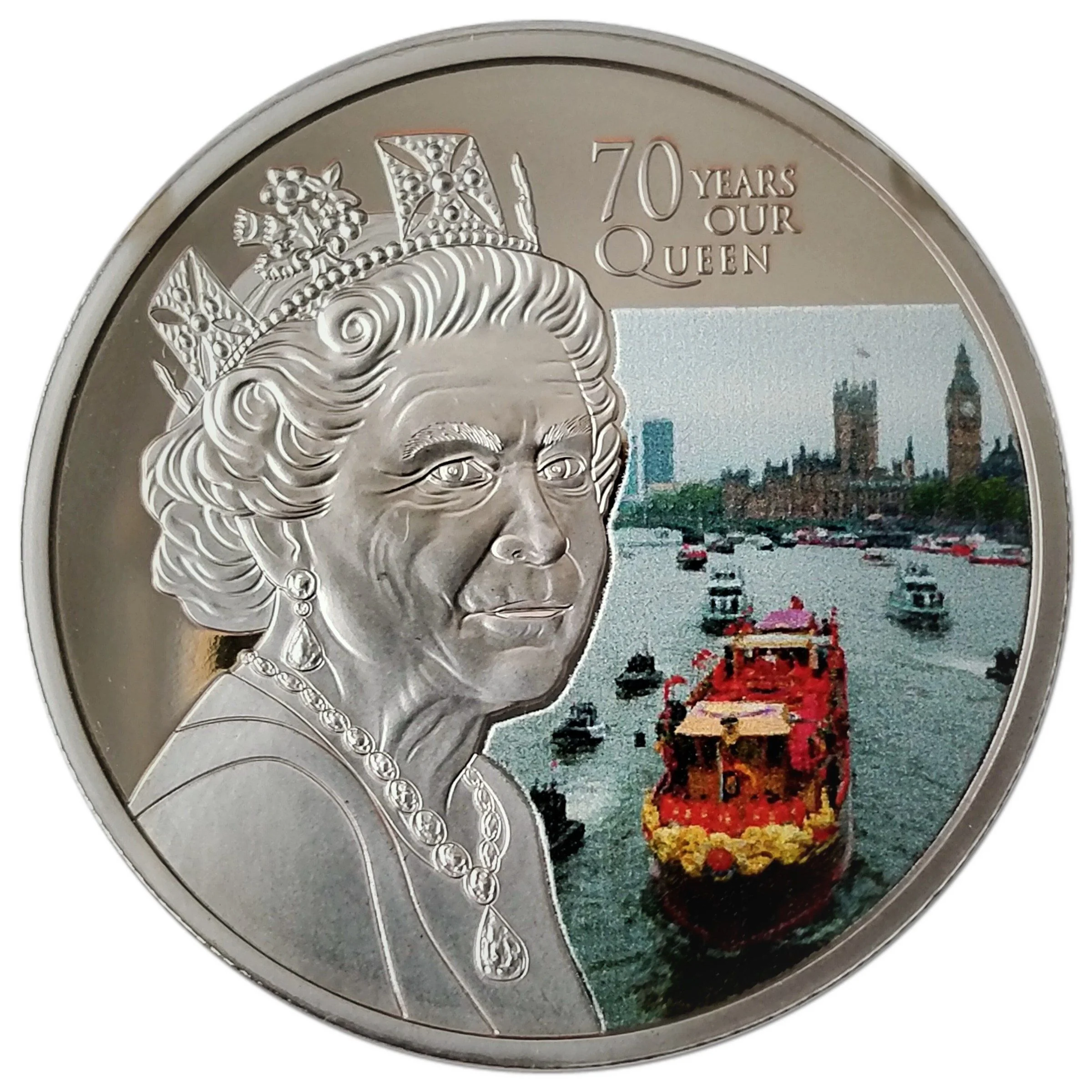 A 2010 bust of Queen Elizabeth II facing right, with the Thames Diamond Jubilee Pageant in the background.