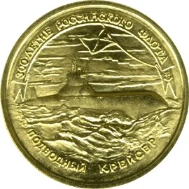A submarine cruiser and St. Andrew's flag, encircled by inscriptions: "300-ЛЕТИЕ РОССИЙСКОГО ФЛОТА" above, "ПОДВОДНЫЙ КРЕЙСЕР" below, with the mint mark left and "1996" right.