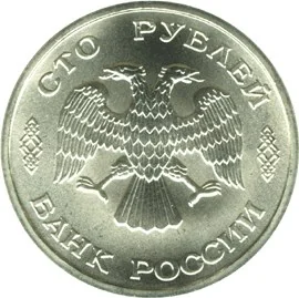 Bilibin's two-headed eagle design, with "СТО РУБЛЕЙ" above and "БАНК РОССИИ" below the rim, separated by an ornament.