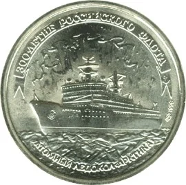 The coin depicts the nuclear icebreaker "Arktika." Inscriptions: above, "300-ЛЕТИЕ РОССИЙСКОГО ФЛОТА"; below, "АТОМНЫЙ ЛЕДОКОЛ 'АРКТИКА'." To the left is the mint mark, and to the right, the date "1996."